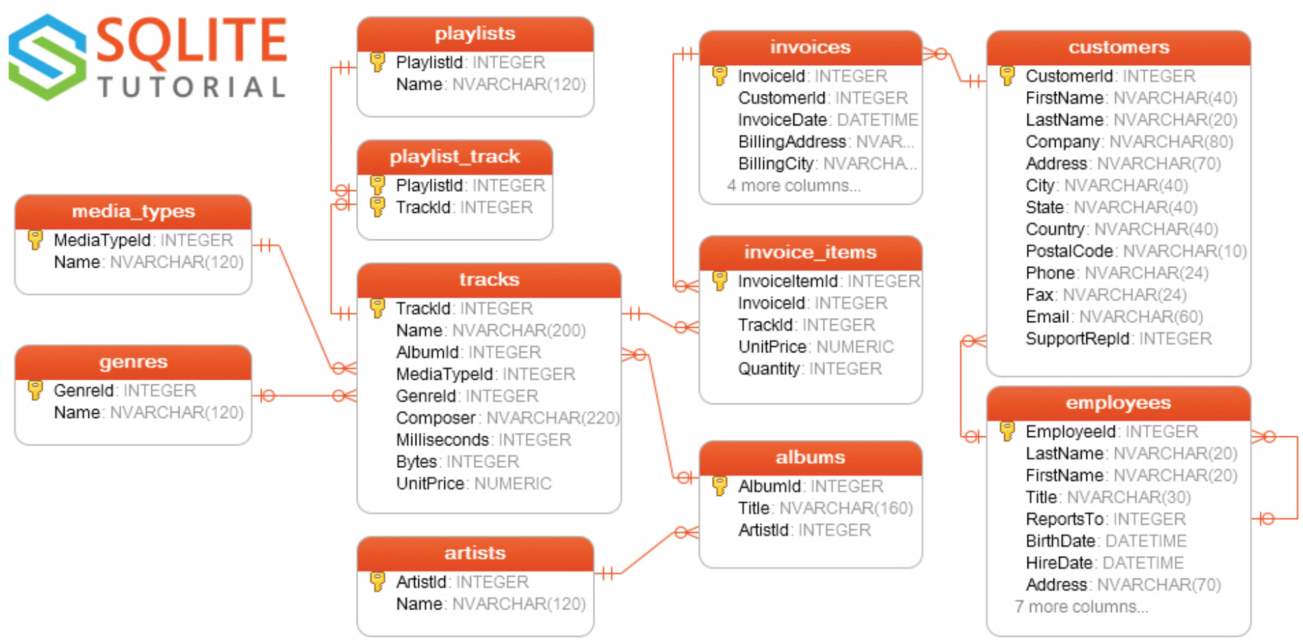 We're going to use a sample database (from SQLite Tutorial) which we first need to import from an SQL 'dump'. A dump is a file containing the schema/setup of a database's tables and/or the data to go in it, made up of SQL statements which can be run to create the tables and/or populate them with the data in your database. Here's the structure of the database we'll be using - you may want to open it in a different tab to refer back to at various times: